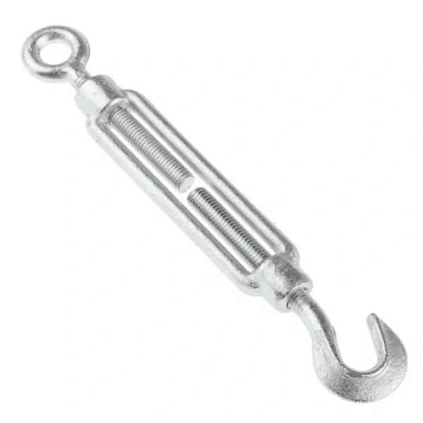 Hook and eye Turnbuckle, featuring a hook on one end and an eye on the other, which provides quick or temporary connections. Its design is particularly valuable in applications requiring rapid adjustments and detachment.