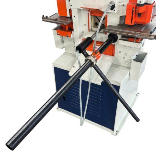 - Has an electronic button on the adjustable backgauge. When pressed the guillotine/shear function is activated and the steel material is cut.
